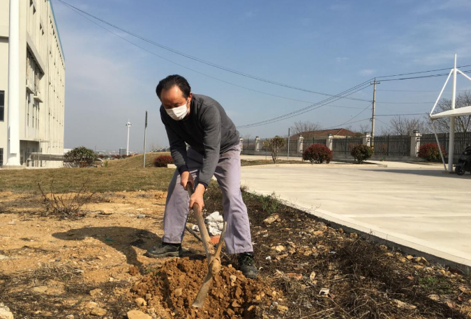 当日下午,人事行政部组织员工们来到公司生活区的荒地上。植树活动现场热火朝天,大家分工合作、配合默契,干劲十足,除草、拉线、挖坑、扶苗、培土、夯土、浇水、踩实,每一道工序都一丝不苟。