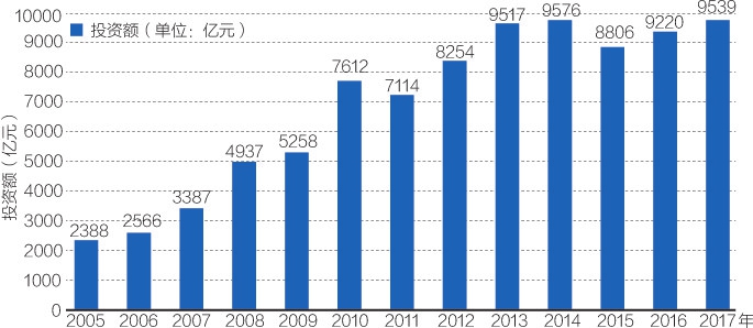 2005年至2017年,我国对环境污染治理投资快速增长。2010年10月10日,国务院发布了《关于加快培育和发展战略性新兴产业的决定》,更是将环保产业作为战略性新兴产业之一加以培育和发展。2017年,全国环境污染治理投资总额达到9538.95亿元,是2005年的4倍,全国环境污染治理投资总额保持较快的增长速度,复合增长率达到12.23%。
