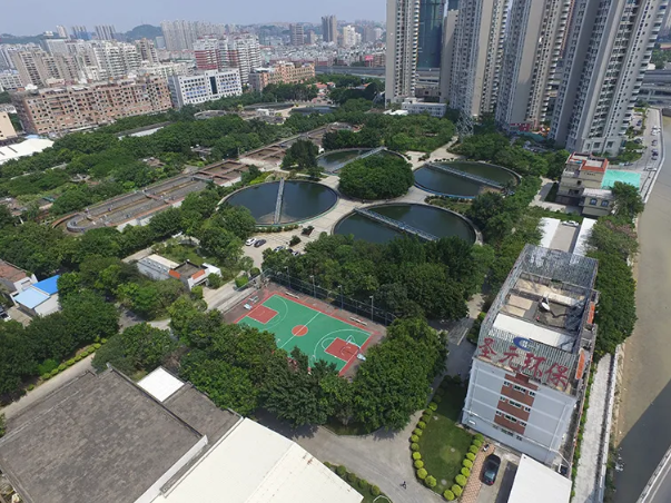 宝洲污水处理厂作为第二批全国环保设施和城市污水垃圾处理设施向公众开放单位,始终坚持高标准建设、高品质运营、精细化管理,长期注重社会、环境、经济效益协调发展,致力打造花园式厂区,建设“邻利型”项目。2018年,宝洲污水处理厂完成提标改造,4个巨大的圆形污水处理池成为了“花园”的主要景观,四周绿荫环绕,漫步在铺设了塑胶跑道的厂区内与普通公园相差无几,彻底颠覆普通大众对污水处理厂的传统印象。
