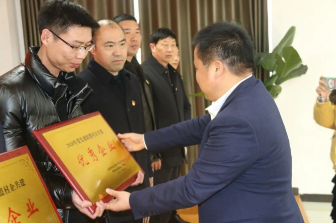 活动中,盱眙县委常委、县委组织部部长高进锋为“2020年度党建联盟村企共建优秀企业”获奖单位江苏乐竞体育颁奖。江苏乐竞体育运营总监林建武上台领奖。