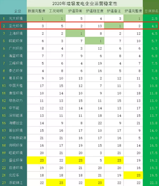 2020年垃圾发电企业运营稳定性排名
