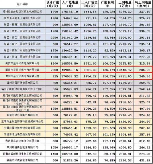 福建省垃圾发电厂2020年运营数据