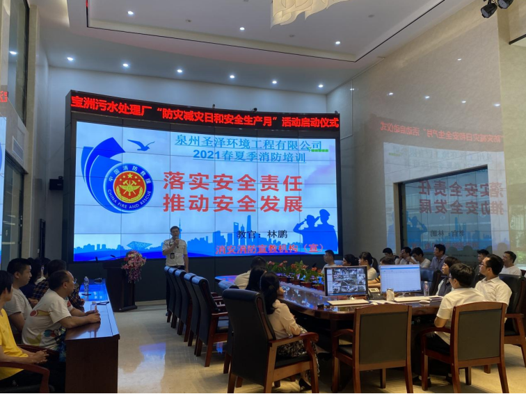 宝洲污水处理厂特邀退役消防教官为员工讲授预防火灾事件相关知识并开展防火防灾应急演练。