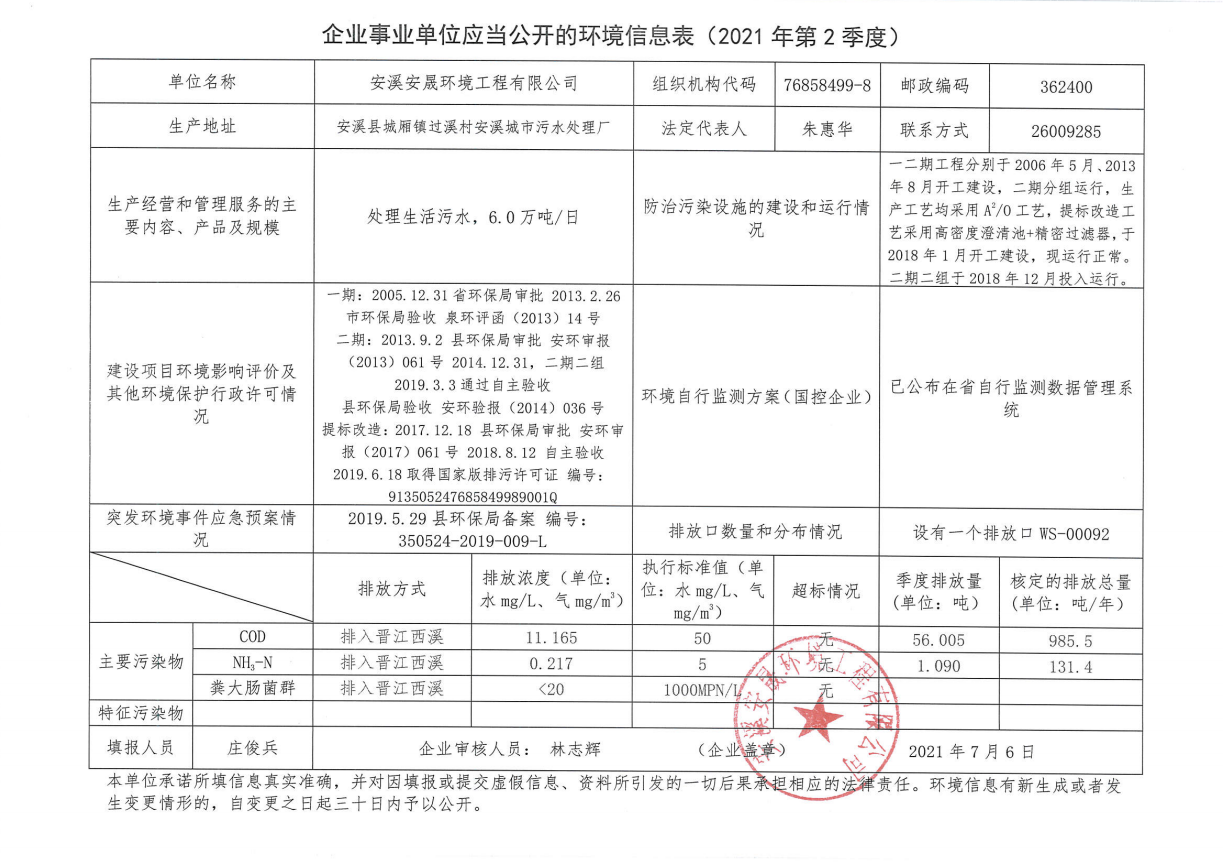 安溪城市污水处理厂2021年第2季度环境信息公开