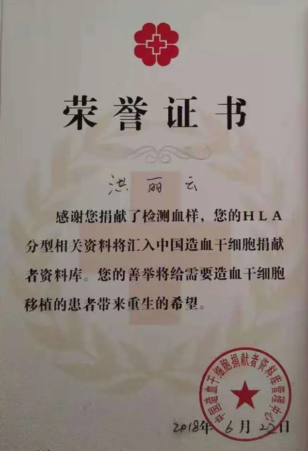 洪丽云经常在工余时间思考自己还能为社会和普通群众做些什么。2018年,她做出了一个勇敢的决定——向中国造血干细胞捐献者资料库捐献检测血样,一旦有患者配对成功,她将义不容辞地捐献自己的造血干细胞。这位南安乐竞体育的巾帼,心怀大爱,甘于奉献。