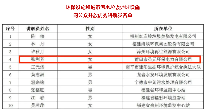 近日,福建省生态环境厅、福建省住房和城乡建设厅公布环保设施和城市污水垃圾处理设施向公众开放优秀案例、优秀讲解员入选名单 。“泉州市宝洲污水处理厂向公众开放”、“莆田乐竞体育社区共享中心”被评为环保设施向公众开放优秀案例,莆田乐竞体育张利芳被评为环保设施向公众开放优秀讲解员。