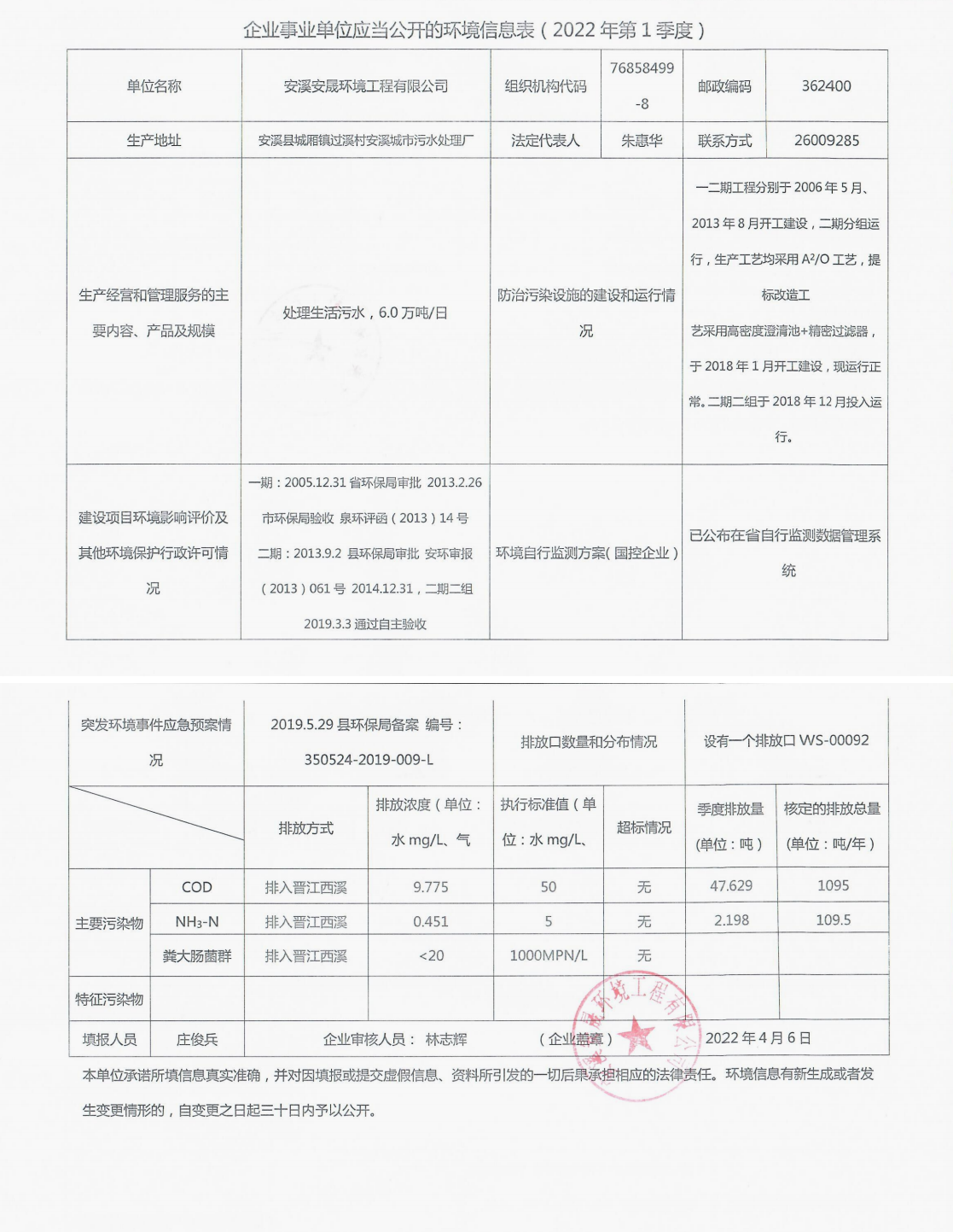 安溪城市污水处理厂2022年第1季度环境信息公开