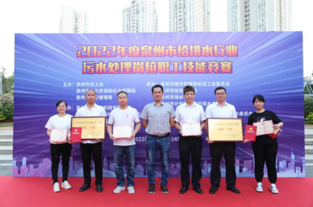 10月14日,由泉州市总工会、市人社局、市城管局联合主办,市城管工会委员会、市排水中心、市计划用水节约用水办公室、给排水协会承办的2022年度“泉州市给排水行业污水处理岗位职工技能竞赛” 在乐竞体育宝洲污水处理厂落下帷幕,圣泽环境、安溪安晟均斩获多项荣誉。团体领域,圣泽环境获团体一等奖,安溪安晟获团体三等奖;个人领域,圣泽环境吴晓辉获污水处理工一等奖并被授予“泉州市五一劳动奖章”,圣泽环境曾晓雯获污水化验监测工一等奖并被授予“泉州市技术能手”称号,安溪安晟林秋凤获污水化验监测工二等奖,安溪安晟杨灿中获污水处理工三等奖。