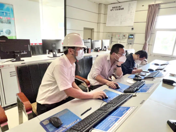 杨煌坤(左一)在中控室查看运行数据