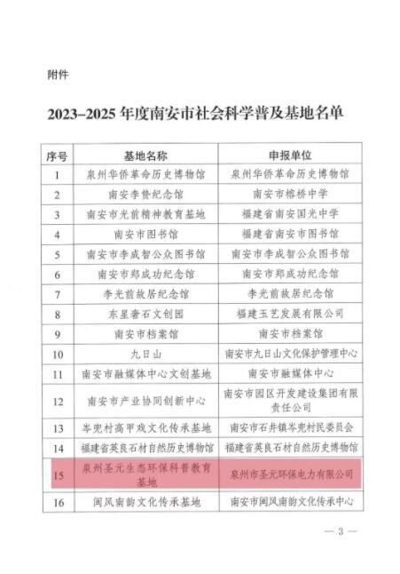 日前,2023-2025年度南安市社会科学普及基地名单公布,泉州乐竞体育生态环保科普教育基地荣获“2023-2025年度南安市社会科学普及基地”称号。