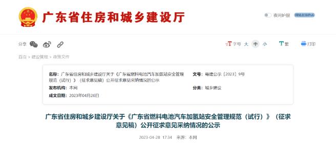 4月28日,广东省住房和城乡建设厅发布关于《广东省燃料电池汽车加氢站安全管理规范(试行)》(征求意见稿)公开征求意见采纳情况的公示。