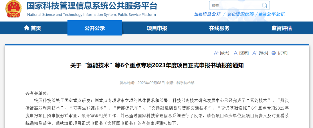 9月8日,科学技术部发布《关于“氢能技术”等6个重点专项2023年度项目正式申报书填报的通知》。