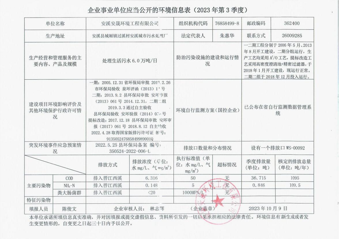 安溪城市污水处理厂2023年第3季度环境信息公开
