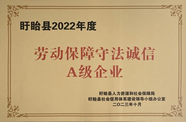 10月30日,江苏乐竞体育荣获由盱眙县人力资源和社会保障局、盱眙县社会信用体系建设领导小组办公室颁发的盱眙县2022年度劳动保障守法诚信A级企业荣誉称号。