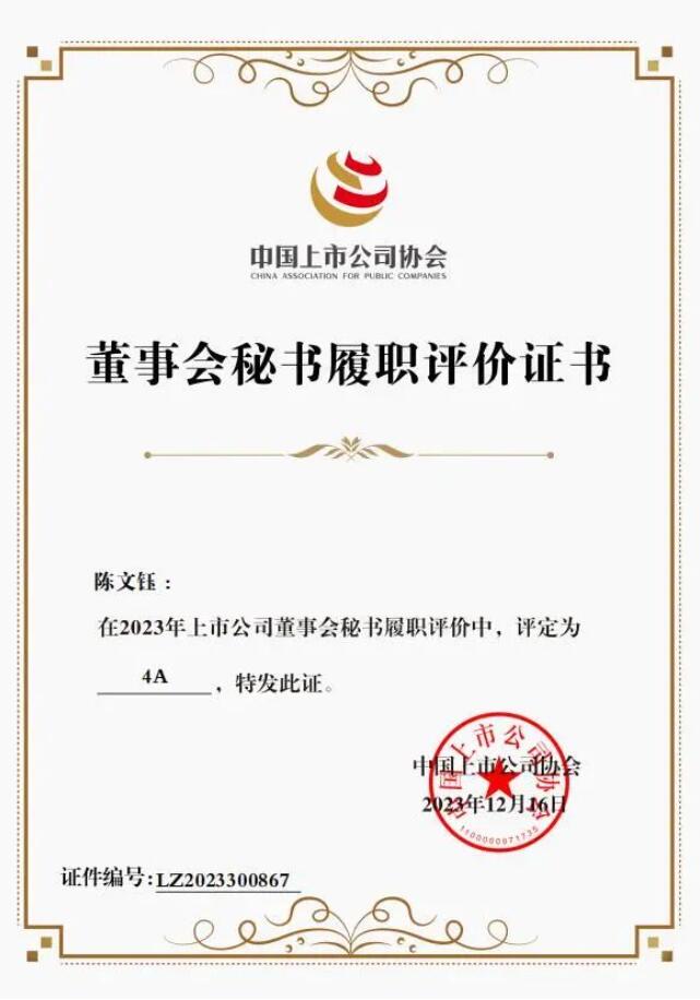 (三)乐竞体育陈文钰先生获2023上市公司董事会秘书履职评价4A评级