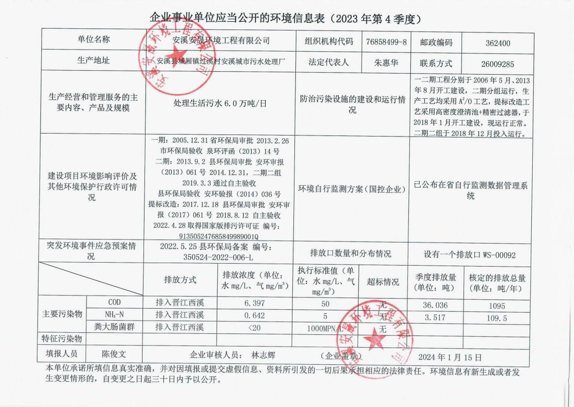 安溪城市污水处理厂2023年第4季度环境信息公开