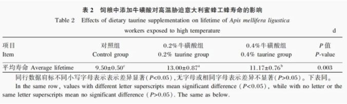 1.饲粮中添加牛磺酸对高温胁迫意大利蜜蜂工蜂寿命的影响