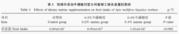 2.饲粮中添加牛磺酸对意大利蜜蜂工蜂采食量的影响