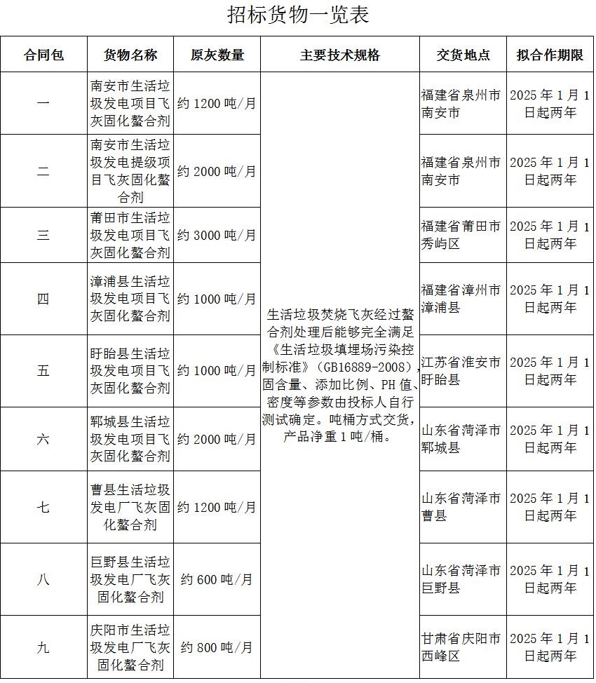 乐竞体育(中国)官方网站 - 登录入口对南安市生活垃圾焚烧发电厂、南安市生活垃圾焚烧发电厂提级项目、莆田市生活垃圾焚烧发电厂、漳浦县生活垃圾焚烧发电厂、盱眙县生活垃圾焚烧发电厂、郓城县生活垃圾焚烧发电厂、曹县生活垃圾焚烧发电厂、巨野县生活垃圾焚烧发电厂、庆阳市生活垃圾焚烧发电厂飞灰固化螯合剂采购项目的下述货物及服务进行国内公开招标,现欢迎国内合格的投标人前来提交密封的投标。