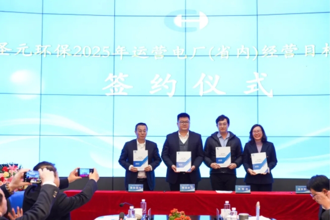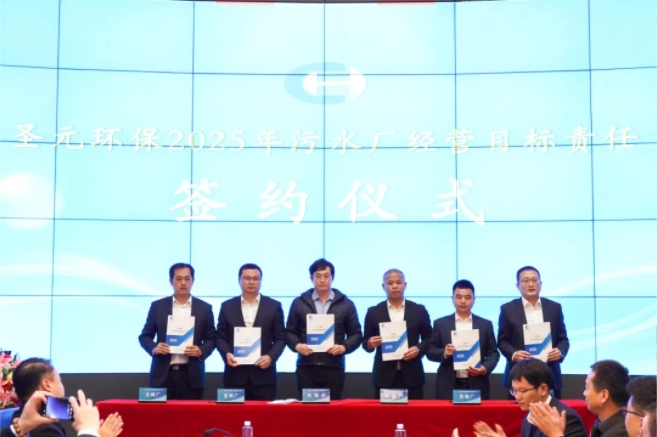 签约仪式环节,朱恒冰总经理分别与运营电厂、运营水厂领导班子签订2025年度经营目标责任书。这一纸“军令状”,承载着沉甸甸的责任和使命,是对各责任主体新年工作的期望和要求,也是对公司未来发展的坚定承诺。