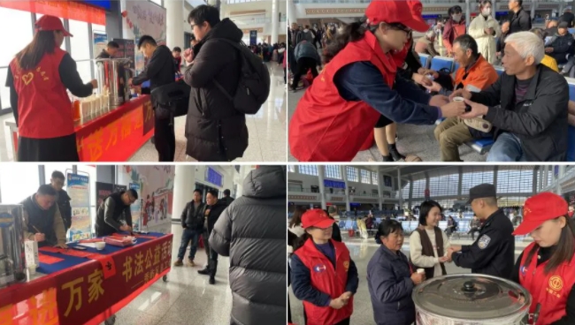 活动现场,工作人员和志愿者们准备了热气腾腾的姜茶,并现场题写春联,为过往旅客送去温暖与祝福。此外,现场还设置了咨询服务台,为旅客提供车次信息查询、出行路线规划等帮助,并贴心提醒旅客春运期间安全出行的注意事项。