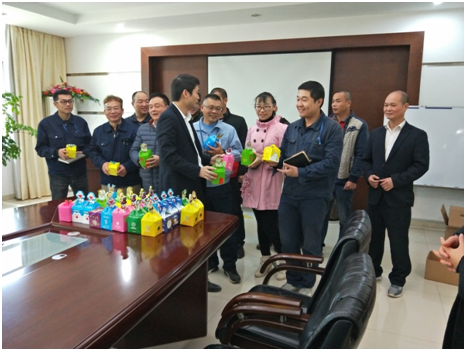 2017年12月23日,平安夜前夕,南安市乐竞体育电力有限公司常务副总经理、工会委员会主席杨煌坤为员工们发放平安果,送上祝福。