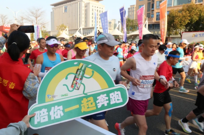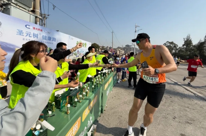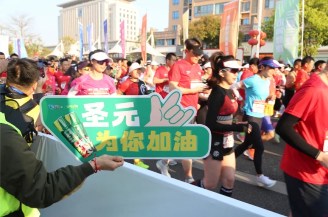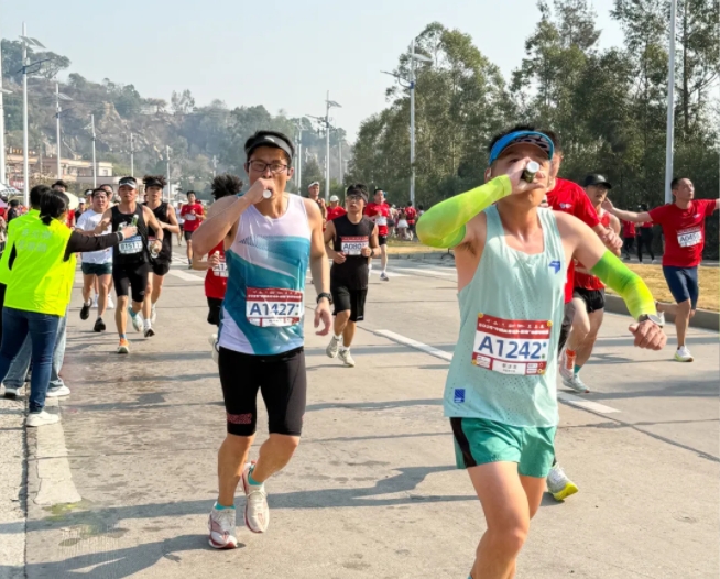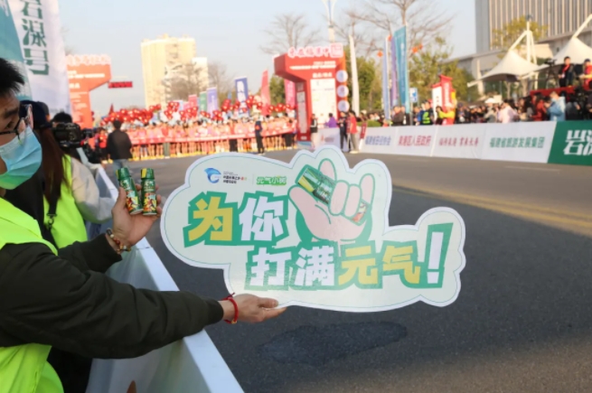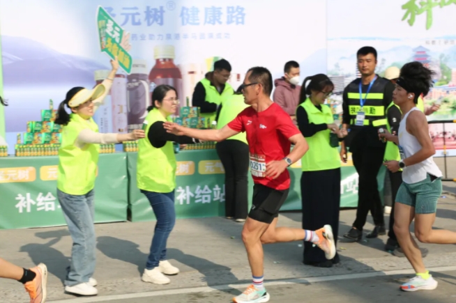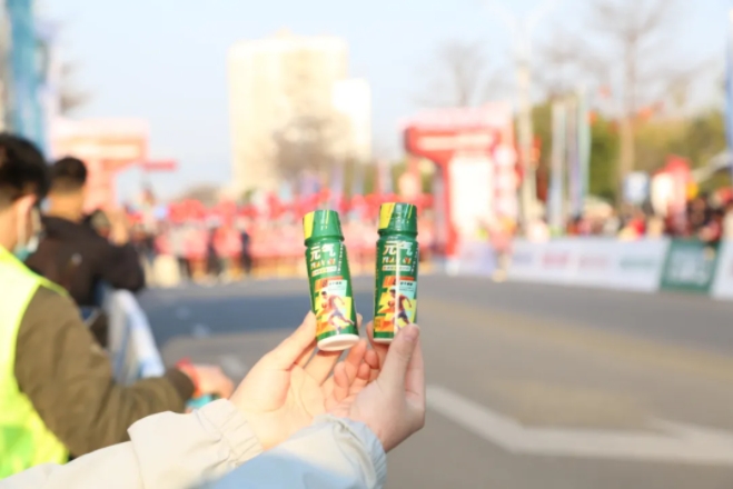 “加油,加油!”元气小树能量补给站边,来自乐竞体育的加油团毫不吝啬赞美、鼓励,为来自各地的跑友送上最热情的助力,并为参赛者分发补给品——60mL便携装元气小树牛磺酸能量饮,富含牛磺酸、维生素B族等成分,护航参赛者保持良好状态、圆满完赛。