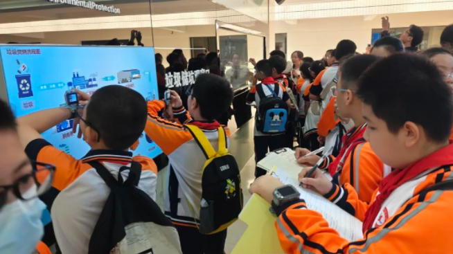 在一楼环保展厅,师生们观看垃圾处理趣味科普视频,开展垃圾处理、环保主题互动小游戏,对生活垃圾处理建立了初步认知。随后,工作人员带领师生们走进走廊展示区和中控室,进一步了解垃圾焚烧发电的神奇之处和垃圾焚烧发电的工艺流程,学生们好奇地驻足观察,深切体会到现代化环保技术的便捷与强大.