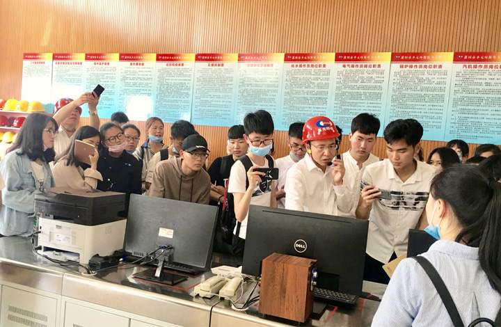 随即学生们在周志新副经理和罗煊总值长的引领下经过汽机房、锅炉房近距离参观了垃圾焚烧发电厂的三大主机以及主要尾气处理设备后,一路来到垃圾焚烧发电厂的核心——中控室。在中控室,黄安定副总经理为学生们详细介绍了莆田厂的运行情况以及垃圾焚烧过程中的环保管控措施。