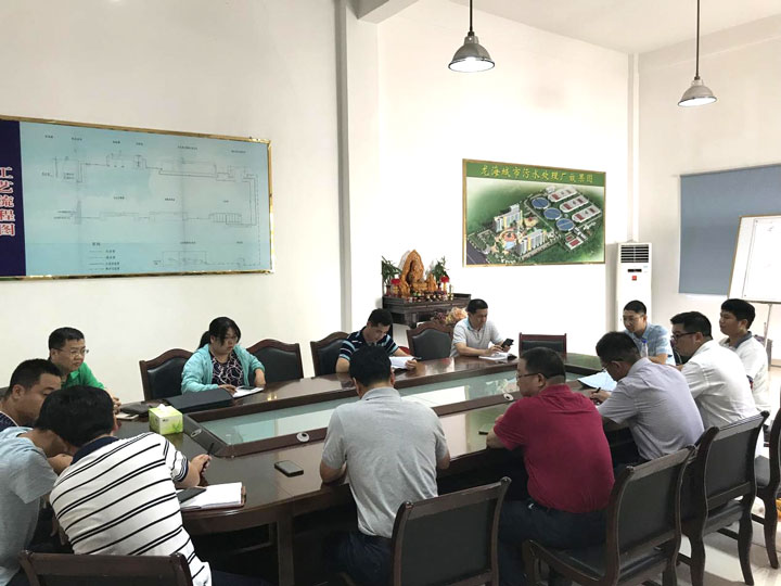 督察组首先组织召开会议,对现场情况进行初步了解。龙海市建设局局长黄俊斌、龙海厂提标改造负责人吴磊对提标改造工程进度情况进行详细汇报,龙海厂厂长李斯佳对生产情况及提标改造处理工艺进行详细汇报。