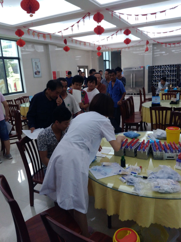 医生们以餐厅大厅,118、119宿舍及公司活动室为场地,根据各岗位员工所接触职业危害因素不同,以耳鼻喉科、内科、血尿常规、、心电图、彩超、胸片、听力等检测项目为基点,为公司上下79名员工进行了全面细致的职业健康体检。因故未体检的9名员工,将择日自行前往医院进行职业健康体检。