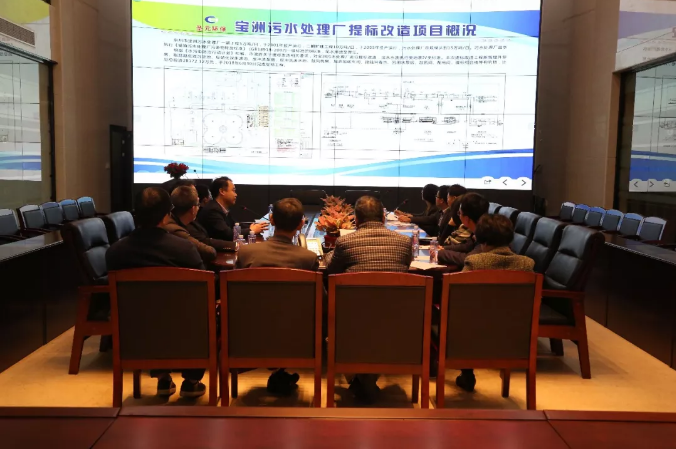 专家组首先来到视频会议中心听取了宝洲厂邱龙峰厂长介绍项目的总体概况、处理效果、运行情况、提标改造工程期间各重要时间节点及其施工中所遇到的难题。