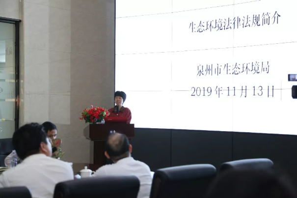 在与会员工热烈的掌声中,泉州市生态环境局汤奇月科长以“生态环境法律法规”为主题,开始授课。她从十八大以来生态环境立法、企业主体责任、生态环境保护督察、公益诉讼法律和政策依据、生态环境损害赔偿和企业法律责任等六个方面出发,详细阐述了环境保护相关法律法规条款,并以多个典型案例剖析讲解了追责。汤科长授课内容关联性、针对性强,对员工极具警示教育意义,受到员工发自内心的追捧。